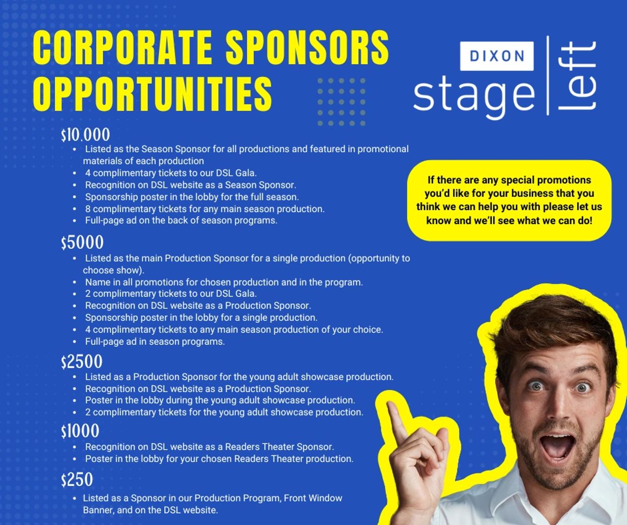 There are many different benefits that come with becoming a sustaining member of Dixon Stage Left, but the greatest of all is knowing your support gives us the stability to take the necessary risks that make the theater better for the whole community, just like the original idea that started DSL 10 years ago.